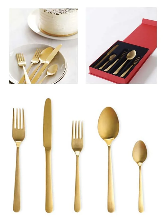 - Gold and Black Almoco Flatware comes packaged in an elegant red gift box.