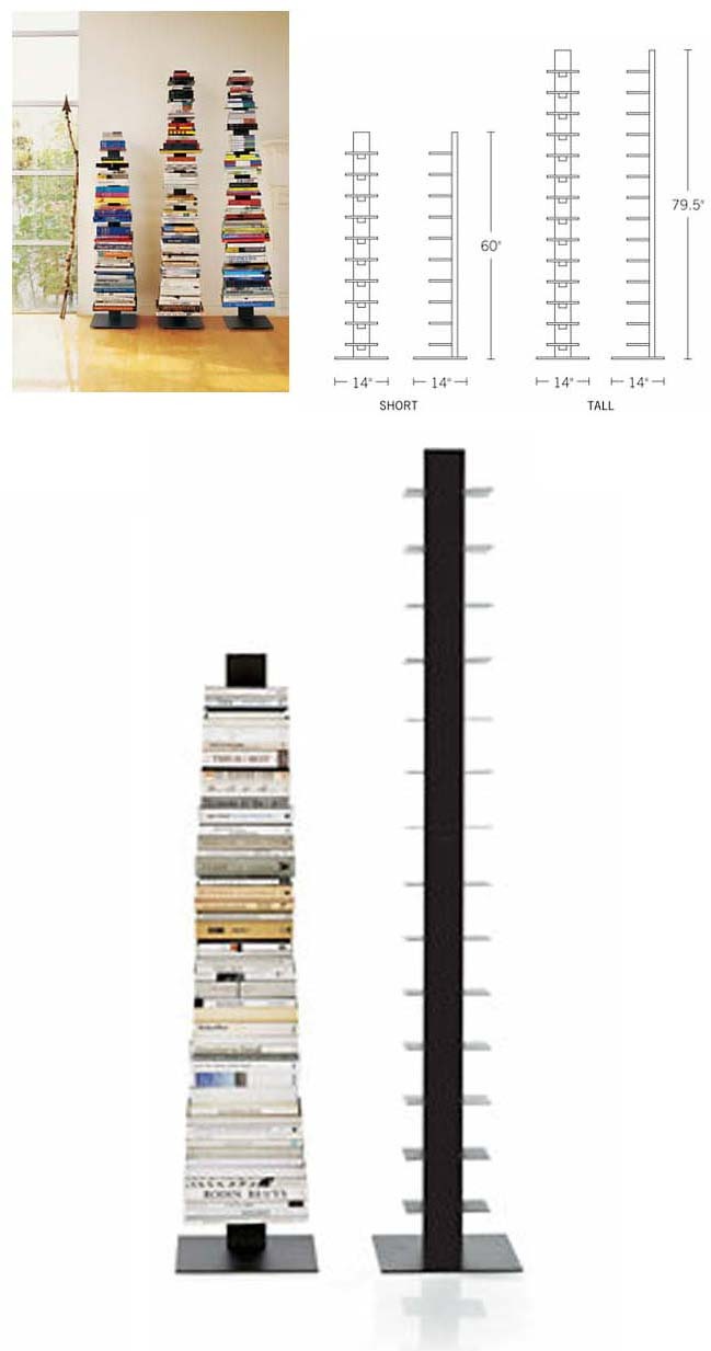 For more than two decades, Bruno Rainaldi has been influencing the design scene in Milan. Whether designing furniture, bringing iconic works back into production or teaching students at the Brera Academy of Fine Arts, where he is a professor. When he designed his Sapien Bookcase (2003), he created a unique solution for those with a lot of books and little space to store them. By holding texts horizontally in a vertical stack, the tall Sapien can accommodate up to 70 small and large books in a very compact footprint. (The shorter bookcase will hold up to 50 books.) The removable shelves are a mere 2mm thick but each one can hold approximately five books, or an impressive 5.5 lbs. The tall Sapien has 14 shelves, the short has 10. When fully loaded, the bookcase virtu¬ally disappears behind the books. All-metal construction and a heavy, weighted base ensure the design’s strength and stability. Made in Italy.